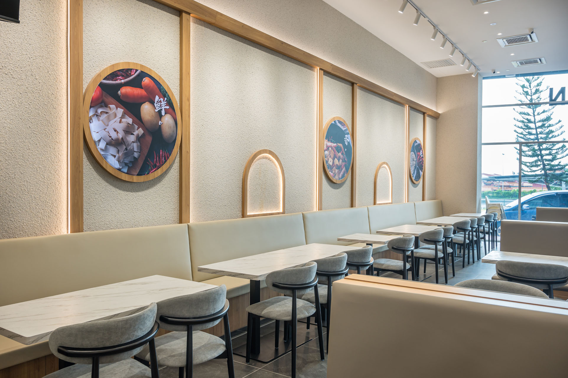 This hotpot kitchen restaurant is a visual feast, blending contemporary elegance with sleek black interiors and timeless wood accents to create an intimate and inviting ambiance. Beige-textured walls and warm wooden furnishings connect diners to nature, elevating the communal hotpot experience into something truly extraordinary.